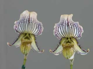 | Paph. rothschildianum | Paph. haynaldianum var. album 'Akiko' |