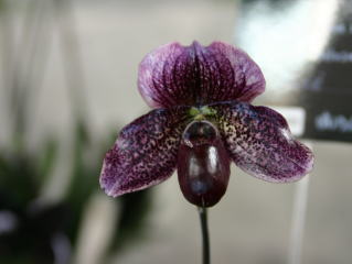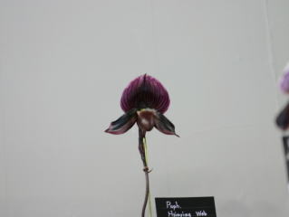 | Paph. Hsinying Web 'Nissho No.4' | Paph. (Clair de Lune x Glendore Wine) 'Black Beauty' |